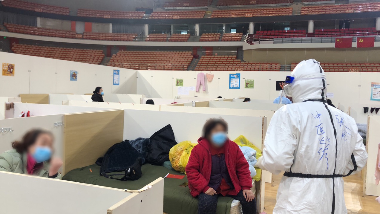 医护人员在方舱医院内巡视病房
